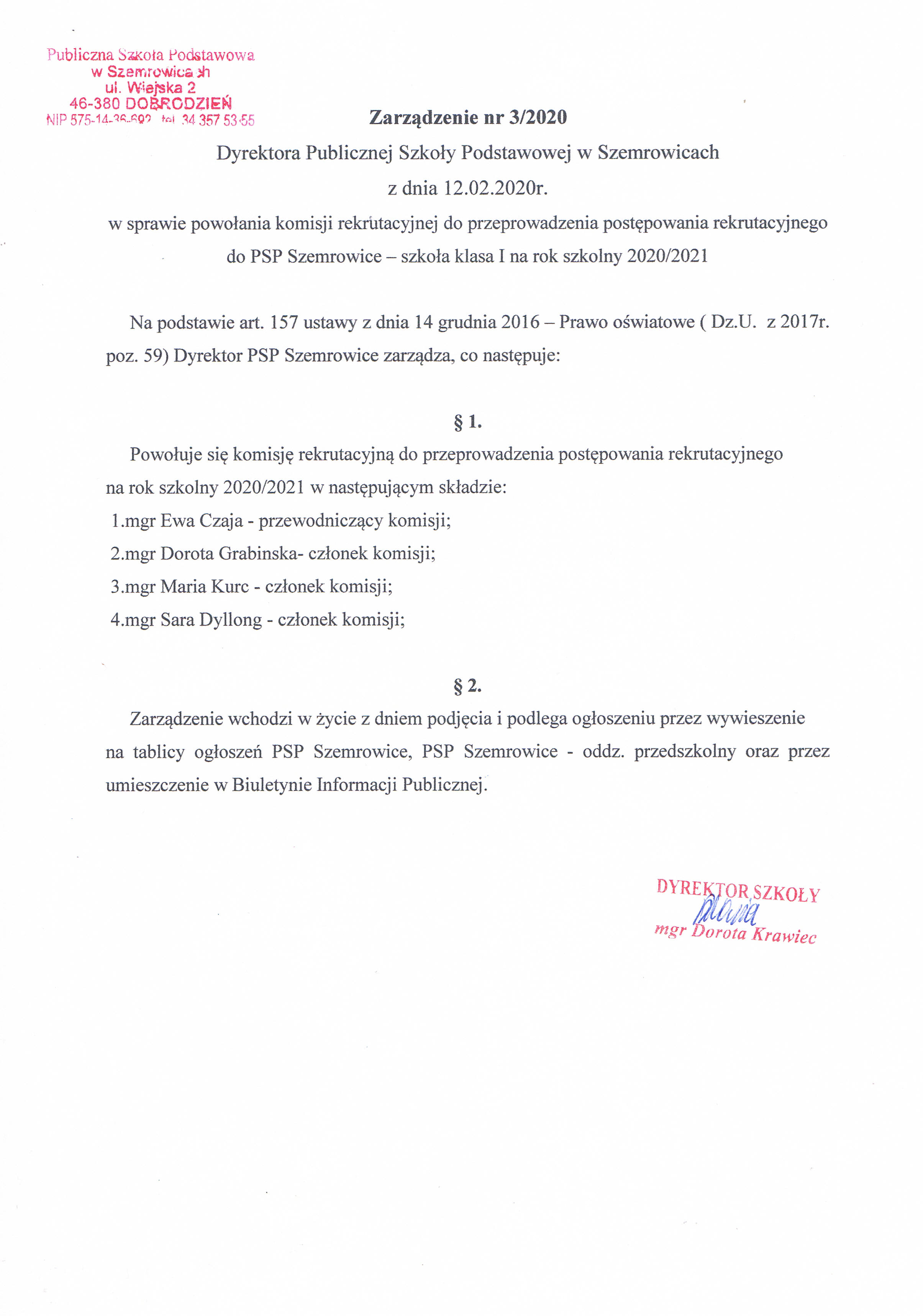 Gabriela Macha) - Dodanie załącznika [zarzadzenie__rekrutacja_klasa_i.jpg] do dokumentu. (Dokument opublikowany)
